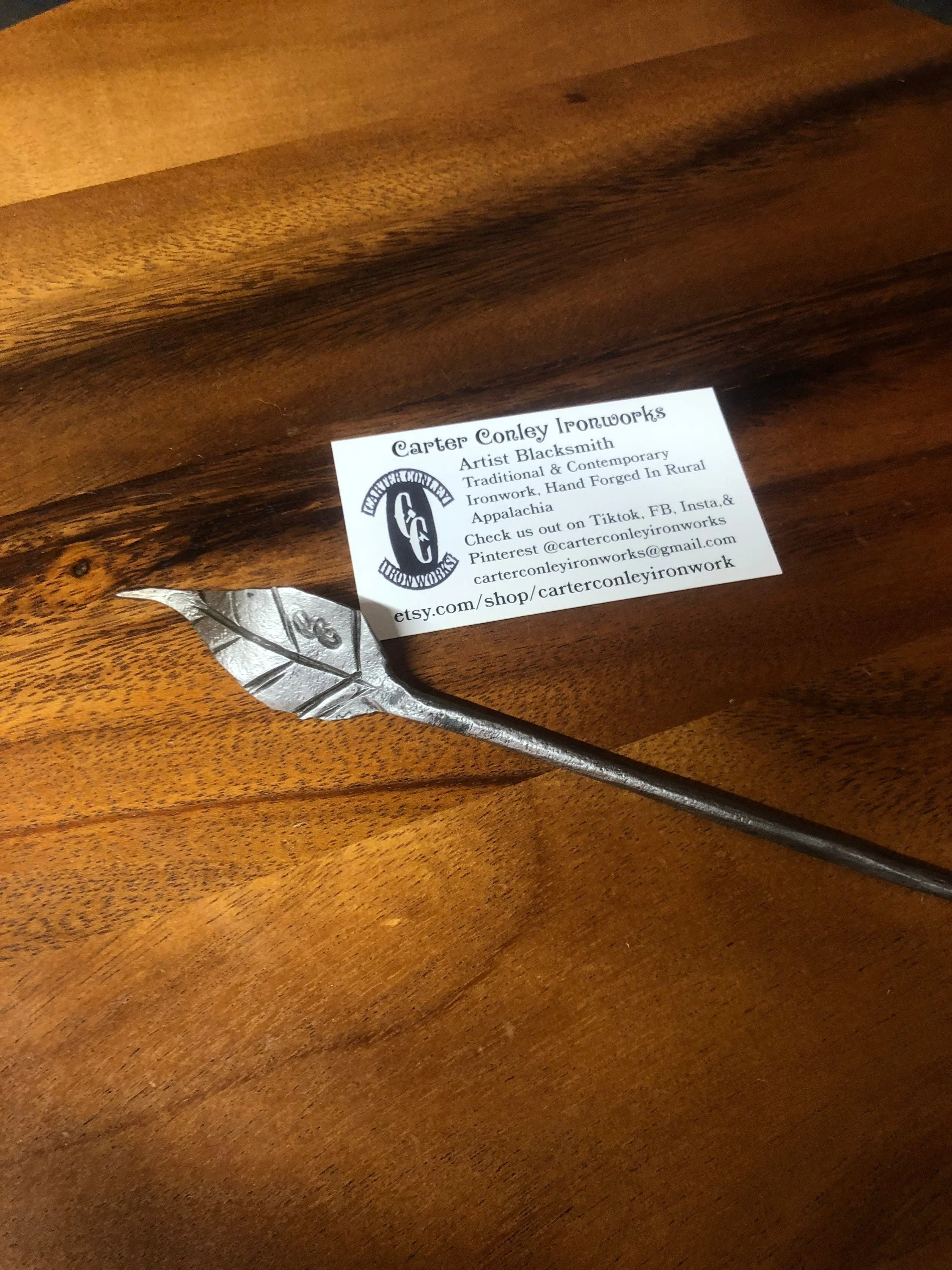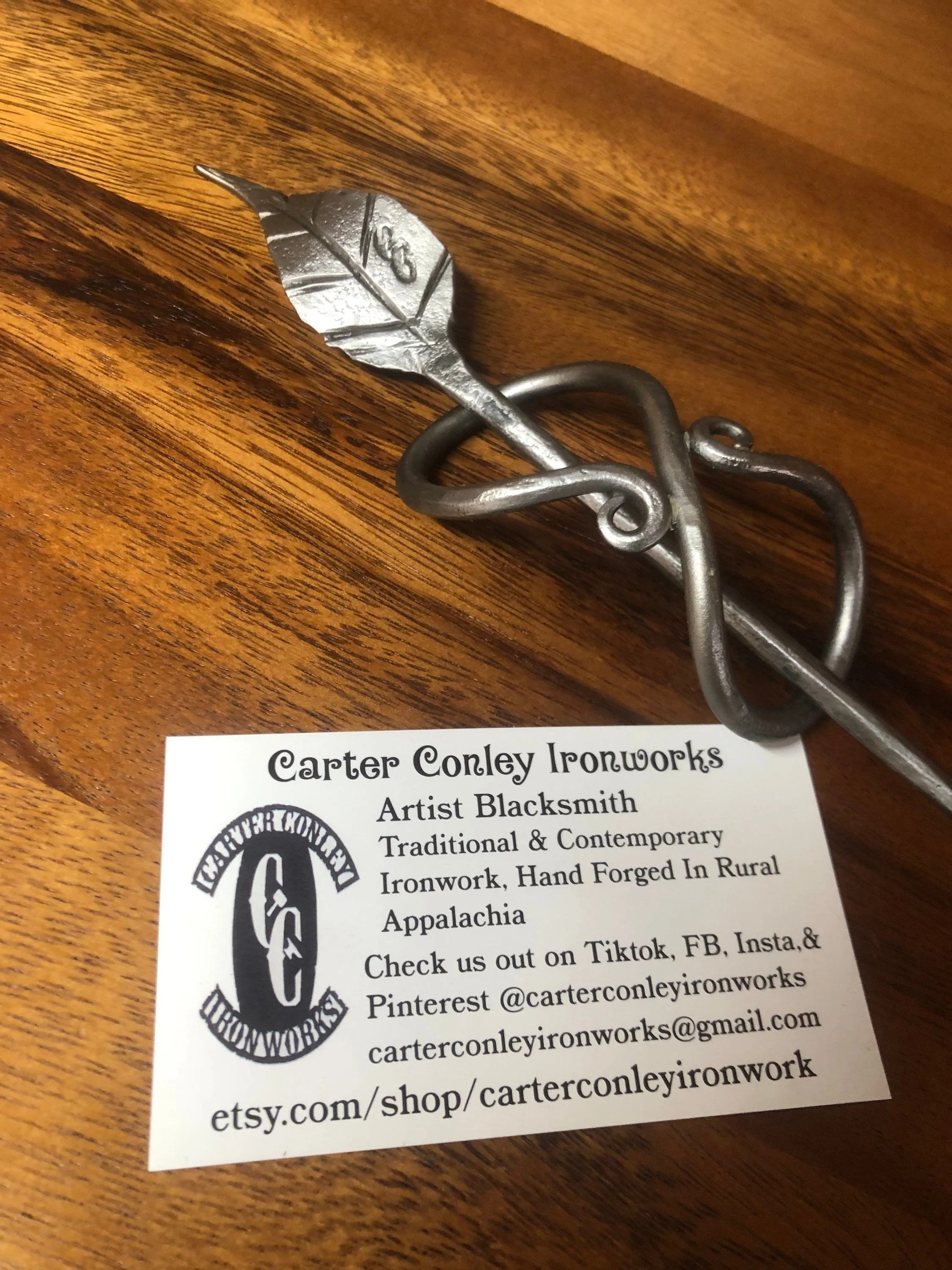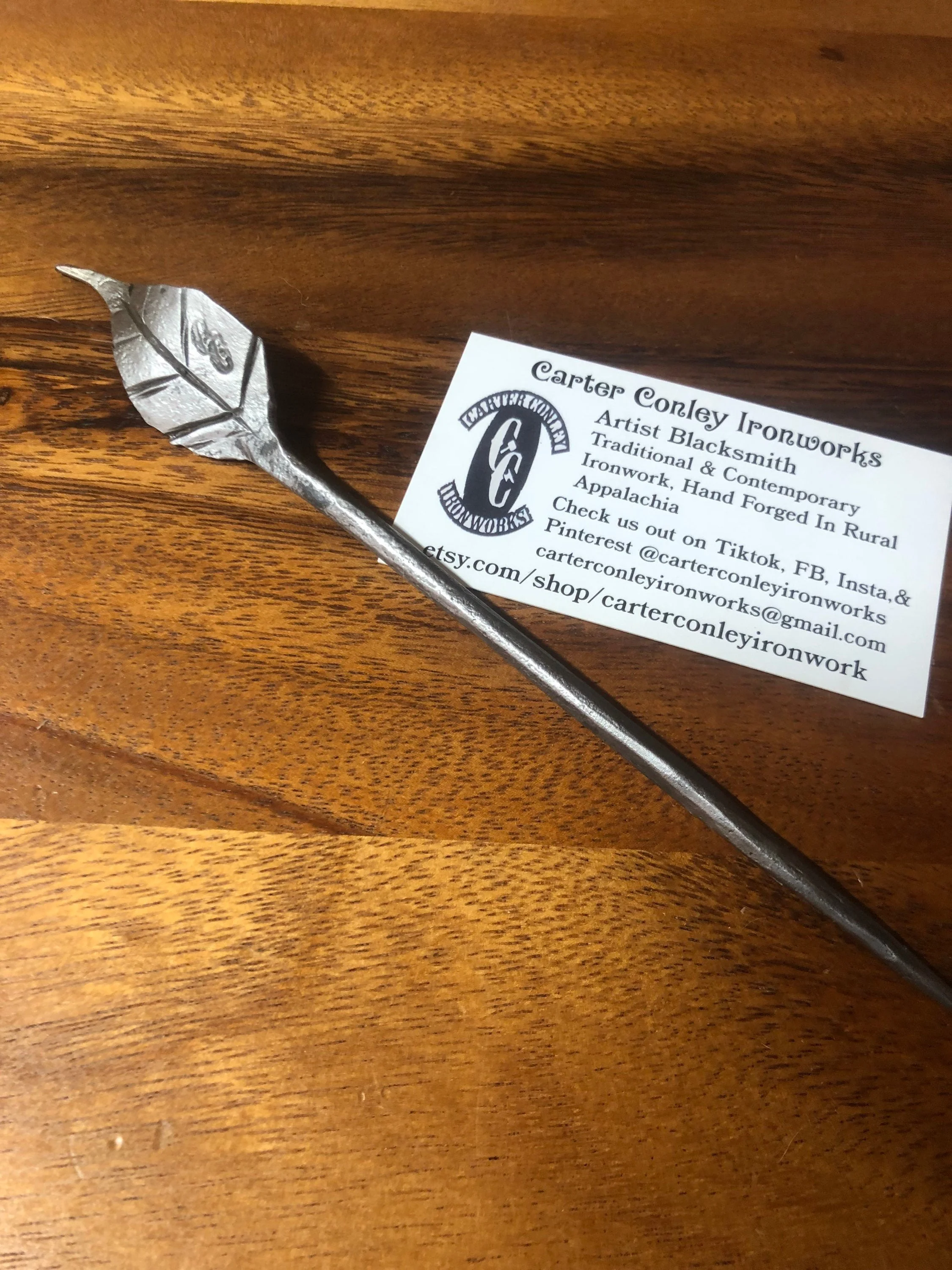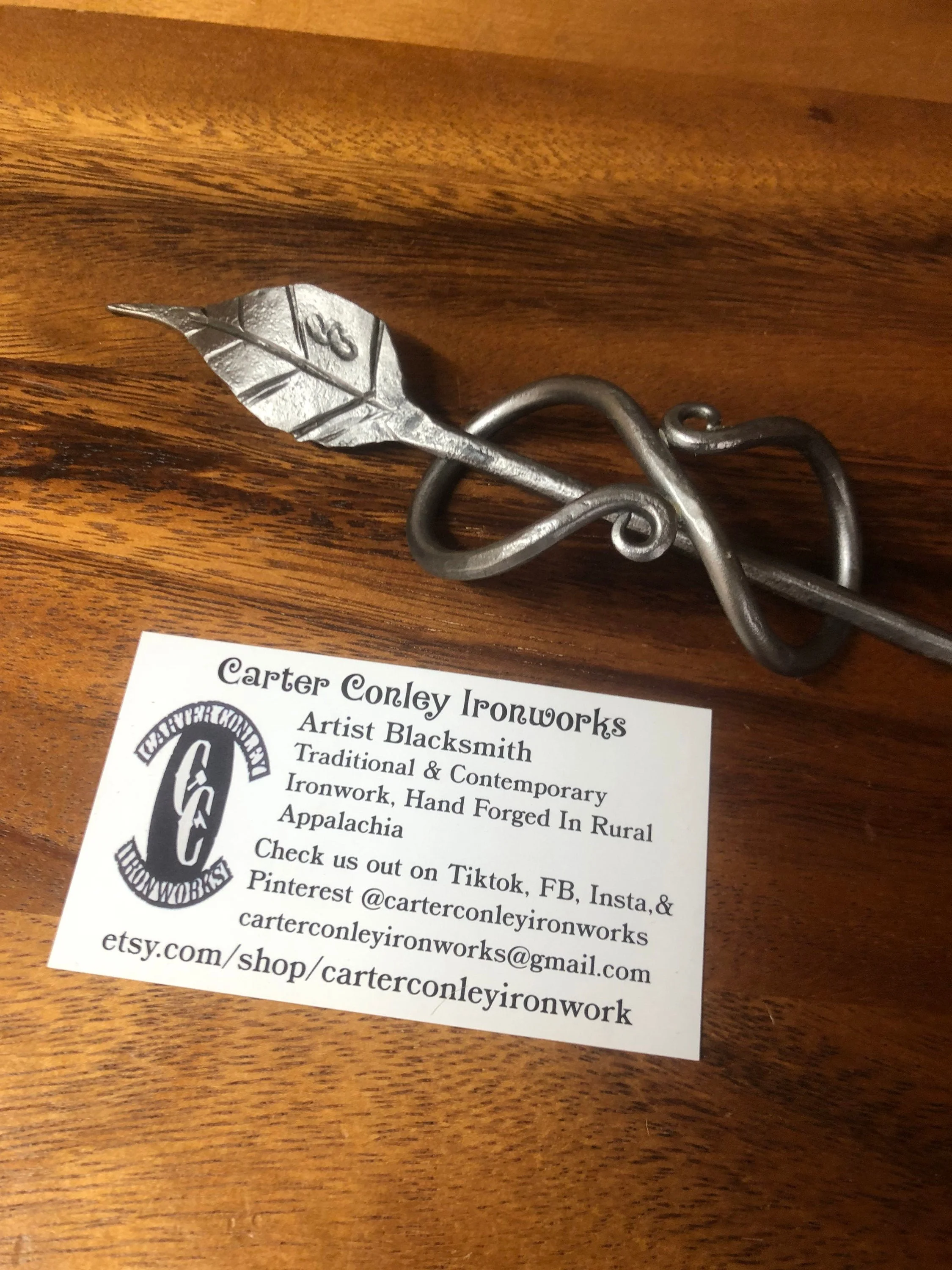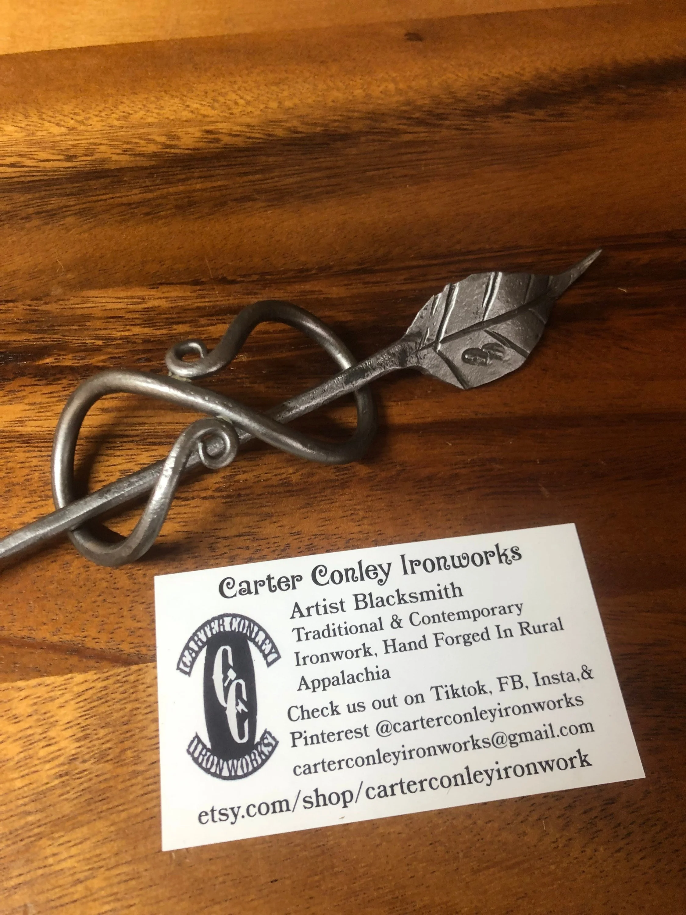 Hand forged in rural Appalachia by artist blacksmith Carter Conley, This organic looking leaf hair pin starts as a few inches of 1/2" round stock. One end of this chunk of steel is forged into the leaf finial while the rest of the material is drawn out to become the hair pin. After forging the leaf veins are added using chisels I've forged for the task, after veining the leaves are given some shape to make them more organic and lifelike. The Hair pins are around 7 inches overall length. Select a small or large barrette depending on you hair type, quantity, and thickness. I use the smallest diameter steel possible for the barrettes to keep the overall weight down. Each Leaf will be slightly different with various nuances while retaining the same overall aesthetic. After forging the forge scale is removed and the pieces are coated with a beeswax based mixture at a low heat to give a nice looking finish that also helps prevent rust. Iron is the Traditional 6 year wedding anniversary gift, Steel is the 11th year. The words Iron and Steel are almost always used interchangeably in Blacksmithing due to the availability of materials Items that would have been made from Wrought Iron, are now made from mild low carbon steel, the closest we as modern smiths can find readily available. Thanks for checking out my blacksmith shop! Carter Conley